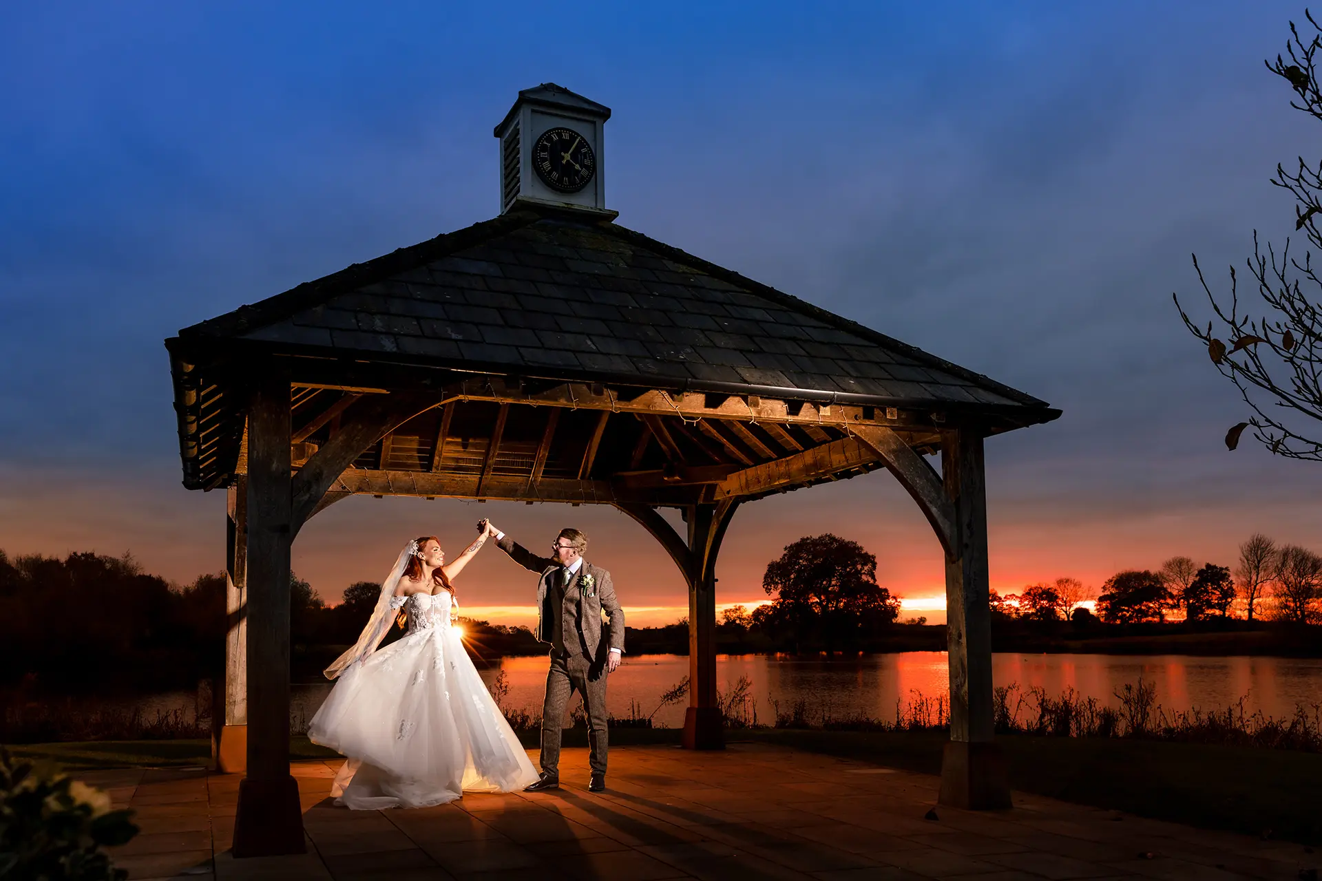 You might also choose a romantic outdoor ceremony by the lake under the enchanting Clock Tower. For winter weddings, the barn exudes warmth with mellow oak beams softly illuminated by wrought iron chandeliers. Guests can watch the sunset over the lake, enjoying the comfort and convenience of having every aspect of your wedding under one charming roof.