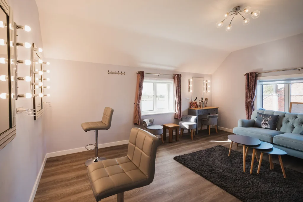 As well as The Dressing Room and The Shepherd’s Hut, we have an additional preparation space that you or your partner can use if you wish. Inside, you’ll find a shower room, comfortable seating, and two hair and makeup stations.